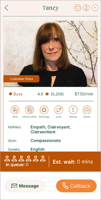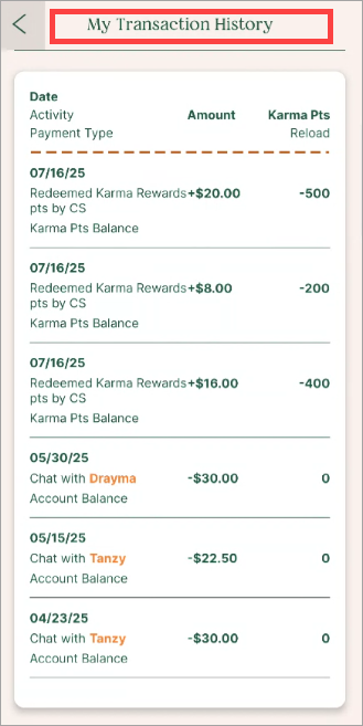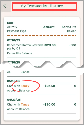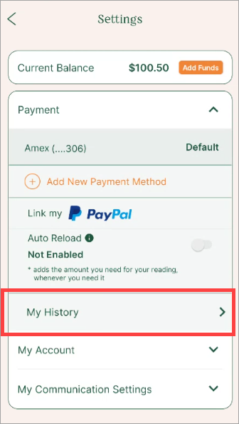 Note: On the My History page, you can also tap on a Psychic's name that displays on the page to go directly to that Psychic's information. Once there, you can view current info about the Psychic, set up another reading, or view their schedule.